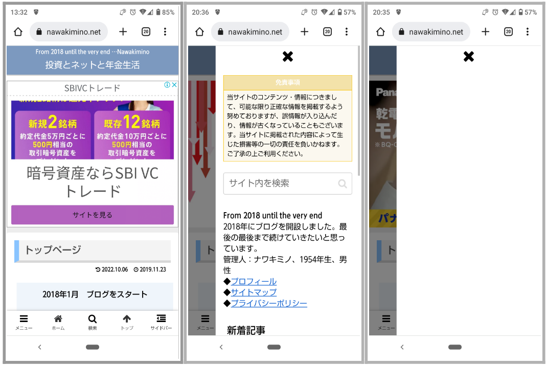 数日後、PCのウェブブラウザで当サイトをチェックしていて、Webブラウザの幅を狭くしてモバイルモードを確認してみたところ、再びサイドメニューの中身が空っぽになってしまいました。根本的な対処になっておらず症状が再発してしまった様です。