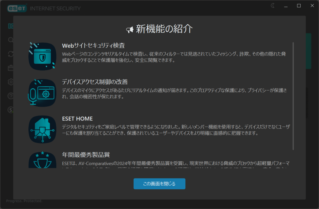 ランサムウェアの挙動をメモリ上で検出する仕組みを採用したらしく、機能的に強化されているらしいです。ハードウェアベースの技術らしいので、動作が遅くなるということもあまり気にしなくて良いんじゃないかな?と感じています。(後に仕事の関係で知りましたが法人向けのESET Endpoint Antivirusの最新版にもこの機能が追加されました。)