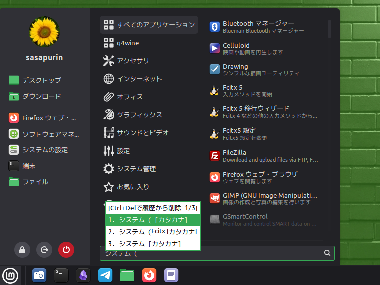 私は家族の連絡用にTelegramを使用している関係上、仕方ないのでibus-mozcを使用するか、fcitx5-mozcに移行することを検討しました。結果的にfcitx5-mozcを採用して、LMスタートボタンからの絞り込みも日本語対応させることにしました。