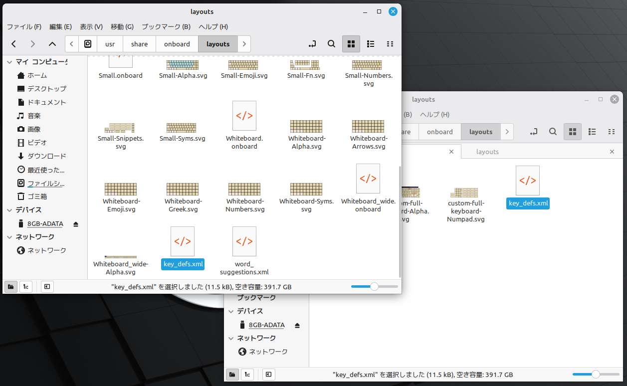 「/usr/share/onboard/layouts/key_defs.xml」ファイルをユーザーフォルダーである「/home/aoipuchu/.local/share/onboard/layouts/」にコピーします。